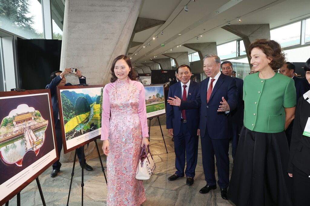 À cette occasion, Tô Lâm et Audrey Azoulay ont visité une exposition de photos des patrimoines culturels et des sites reconnus par l'UNESCO au Vietnam, organisée par le ministère vietnamien de la Culture, des Sports et du Tourisme, en coordination avec la Délégation permanente du Vietnam auprès de l’UNESCO.