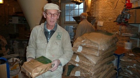 De retour de sa livraison matinale hebdomadaire aux boulangers du coin, Maarten Dolman lance la production du jour : jusqu'à une tonne de farine. Les majestueuses ailes de 26 mètres de diamètre font leur travail.