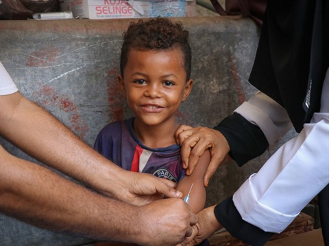 | Un enfant se faisant vacciner à Aden, au Yémen, en février. |
