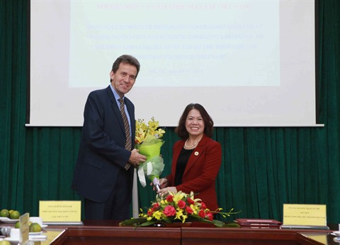 | Le représentant en chef p.i de l’UNICEF Jesper Moller et la présidente de la Croix-Rouge du Vietnam, Nguyên Thi Xuân Thu, le 8 novembre à Hanoï. |