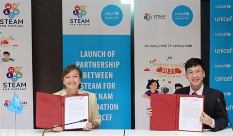 | Lors de la cérémonie de signature du programme de coopération entre l’UNICEF Vietnam et l'organisation éducative STEAM for Vietnam Foundation le 15 juin. |
