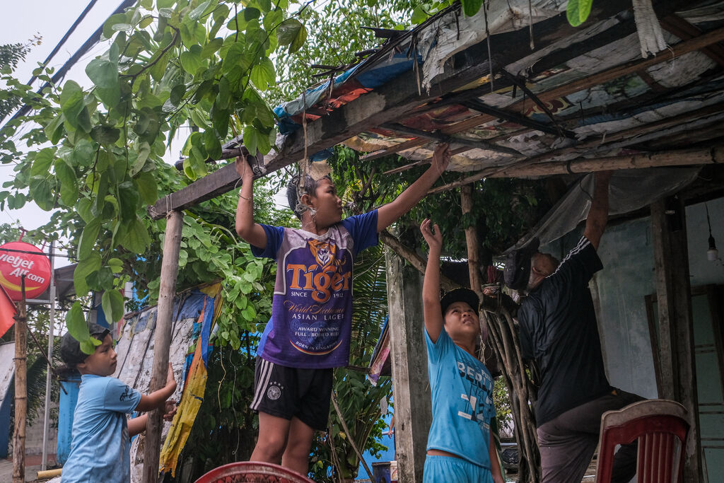 | Des enfants dans la province de Quang Nam aident leur famille à préparer leur maison avant l'arrivée du typhon Noru. |