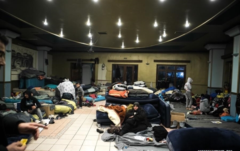 | Des réfugiés dans un centre d'accueil temporaire dans un château montrant, le 14 mars, à Trikala, en Grèce. |