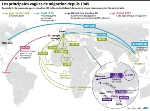| Cartes montrant les principaux afflux de migrants dans le monde depuis la fin de la Seconde Guerre mondiale jusqu'au début des années 2000 |