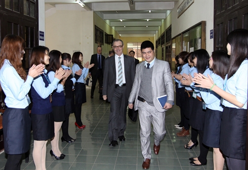 | Le directeur général administratif du Service européen pour l'action extérieure de l'Union européenne, David O'Sullivan (centre, à lunettes), a rencontré le 1er mars à Hanoi des étudiants de l'Académie de diplomatie |