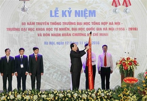 | Le président Trân Dai Quang accroche l'Ordre Hô Chi Minh au drapeau traditionnel de l’Université des sciences naturelles, le 12 novembre à Hanoï |