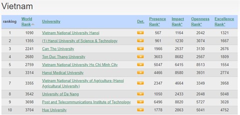 | Le classement des meilleures universités du Vietnam, selon Webometrics |
