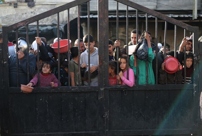 | Habitants attendant dans l'espoir d'obtenir à manger dans la ville de Rafah, au sud de la bande de Gaza, le 14 mars 2024. |