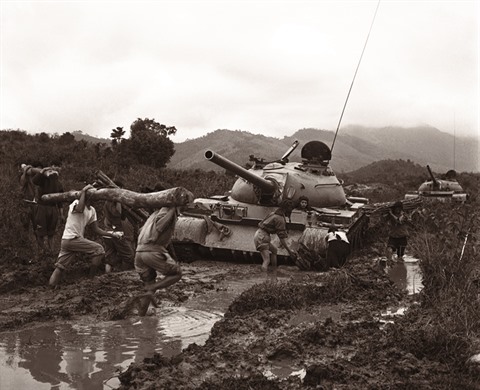 Le cliché Entrée des tanks sur le champ de bataille (1971) met en scène deux chars d’assaut embourbés sur une piste à l’est de la cordillère de Truong Son et des soldats acheminant d’imposants rondins de bois pour les aider à se sortir de ce mauvais pas.