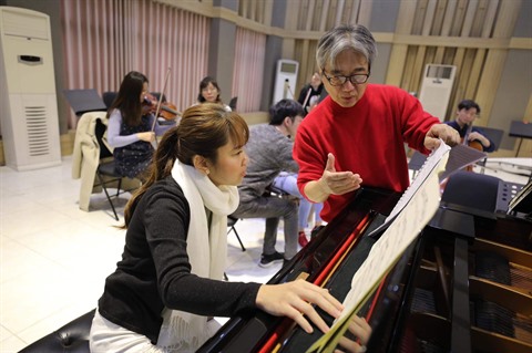 | Répétition de Luong Tô Nhu avec le chef d’orchestre japonais Honna Tetsuji. |