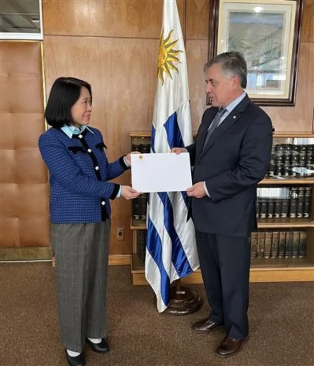 | L'ambassadrice du Vietnam en Argentine et en Uruguay, Ngô Minh Nguyêt, a présenté une copie de sa lettre de créance au ministre uruguayen des Affaires étrangères, Omar Paganini. Photo : VNA/CVN |