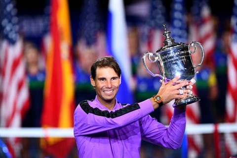 | Rafael Nadal pose avec le trophée de l'US Open après sa victoire en finale sur le Russe Daniil Medvedev à New York le 8 septembre 2019. |