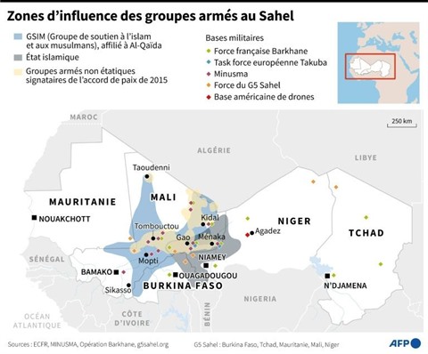 | Zones d'influence des groupes armés au Sahel. |