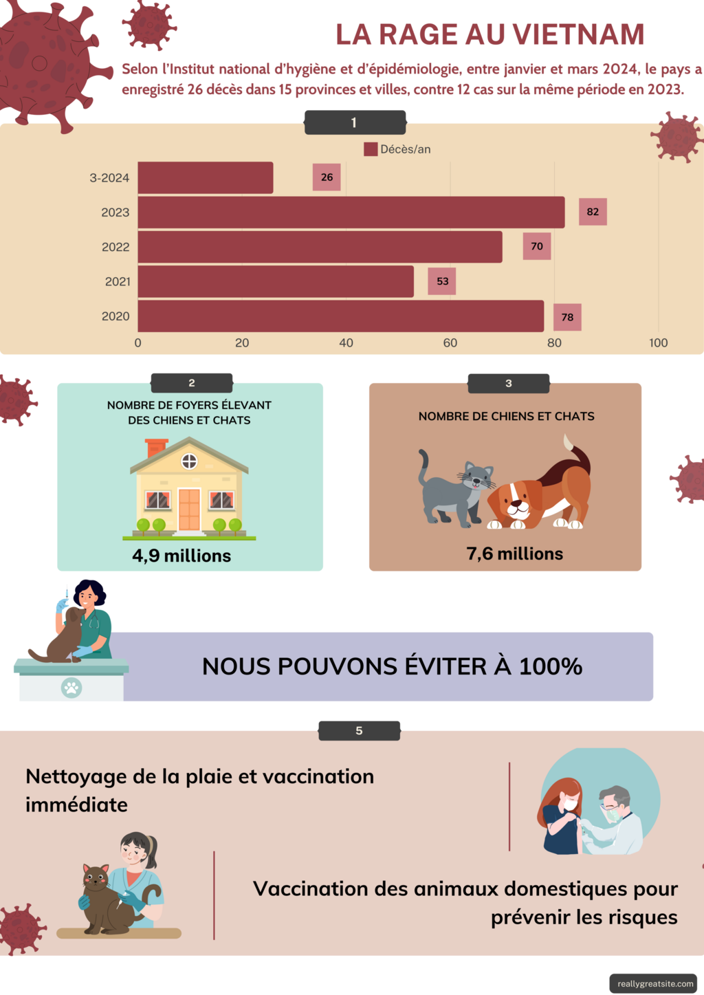 Selon l’Institut national d’hygiène et d’épidémiologie, entre janvier et mars 2024, le pays a enregistré 26 décès dans 15 provinces et villes, contre 12 cas sur la même période en 2023. Les principales raisons de la propagation de la rage sont la mise en liberté incontrôlée des chiens et des chats, l’absence de vaccination contre la zoonose et le manque de gestion stricte de l’élevage des animaux.