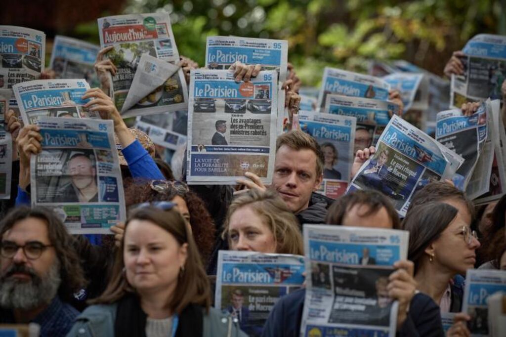 | Des journalistes et des membres du personnel du quotidien "Le Parisien" brandissent des exemplaires de leur journal alors qu’ils se rassemblent devant le siège du groupe Les Echos-Le Parisien pour protester contre la rumeur de vente du journal au groupe Bolloré, à Paris, le 22 septembre 2025. |