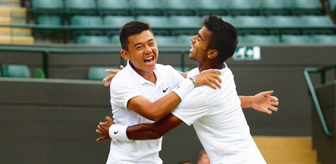 | Ly Hoàng Nam (à gauche) et Sumit Nagal ivres de bonheur après leur victoire en finale du double juniors à Wimbledon. |