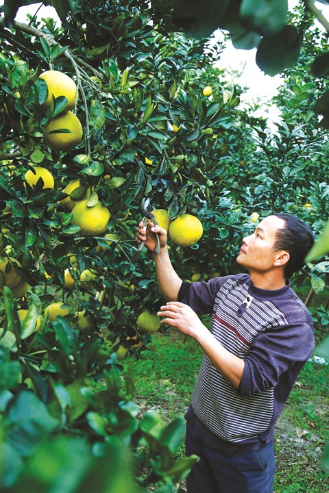 | Ly Van Dang dans son verger de pamplemoussiers chargés de fruits et prêts à la récolte. |