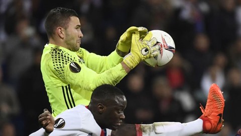| Le gardien de Lyon Anthony Lopes (en haut) arrête le ballon lors du match des 16e retour de l'Europa League au Parc OL, le 9 mars. |