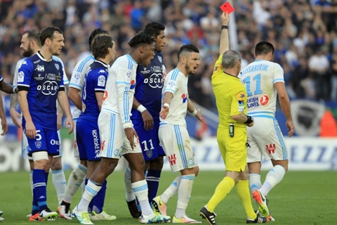 | Expulsion du Marseillais Romain Alessandrini (3e à droite) lors du match à Bastia, le 3 avril. |