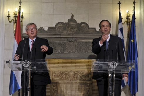| Le président de l'Eurogroupe, Jean-Claude Juncker (gauche), et le Premier ministre grec Antonis Samaras, le 22 août à Athènes. |