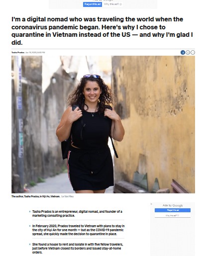 Voici un article qu'elle a publié sur Business Insider portant sur son séjour au Vietnam lorsque l'épidémie de COVID-19 faisait des ravages dans le monde (https://www.businessinsider.com/quarantined-in-vietnam-glad-didnt-return-back-to-us-2020-6).