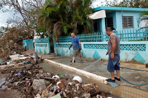 | Deux hommes lavent la boue et les débris devant leur maison à la suite le passage de l'ouragan Maria à Porto Rico. |