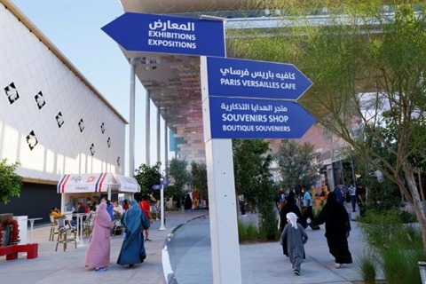 | Des visiteurs de l'Exposition universelle passent près du pavillon de la France, à Dubaï, le 2 décembre. |
