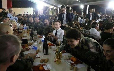 | Le président français Emmanuel Macron (centre) lors du repas de Noël avec les militaires français basés à Abidjan, le 20 décembre 2019. |