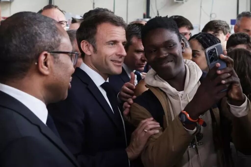 | Le président Emmanuel Macron (2e, gauche) pose pour un selfie avec un étudiant, le 4 mai au lycée pro Bernard Palissy de Saintes. |