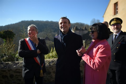 | Emmanuel Macron (centre) accueilli par le maire de Gargilesse-Dampierre, dans l'Indre, avant d'échanger avec des maires et des entrepreneurs, le 14 février. |