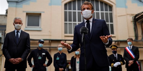 | Conférence de presse d'Emmanuel Macron, masqué, le 28 août 2020 à l'usine Seqens de Villeneuve-la-Garenne. |