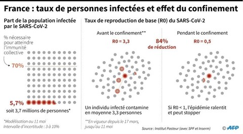 | Données tirées d'une étude de l'Institut Pasteur sur la part de la population française infectée et l'effet du confinement sur le taux de reproduction du virus. |