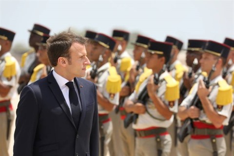 | Le président français Emmanuel Macron passe en revue les troupes de la base opérationnelle avancée (BOA) de Djiboutiqui, le 13 mars. |