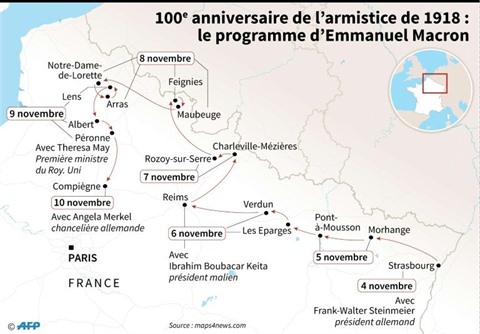 Diplomatique ensuite, alors que M. Macron sera accompagné à plusieurs étapes par des chefs d'État ou de gouvernement étrangers, avant même le bouquet final de dimanche 4 novembre à Paris où on attend notamment les présidents américain Donald Trump et russe Vladimir Poutine.
