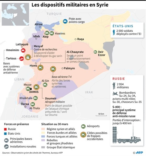 | Principales installations militaires en Syrie, cibles possibles de frappes occidentales, système de défense russe. |
