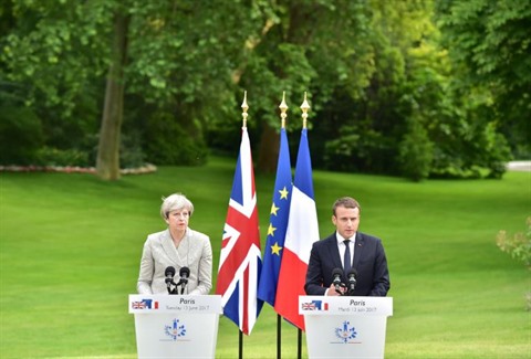 | La Première ministre britannique Theresa May et le président français Emmanuel Macron, le 13 juin à Paris. |