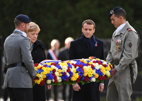 Dans la clairière de Rethondes, au nord de Paris, cernée d'arbres aux couleurs d'automne, le président français et la chancelière allemande ont dévoilé une plaque sur le site de la signature de l'armistice mettant fin aux combats de la Grande Guerre, saignée pour l'Europe et le monde avec 18 millions de morts.