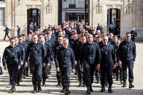 | Des pompiers, qui ont combattu l'incendie à la cathédrale Notre-Dame, arrivent à l'Élysée, le 18 avril. |