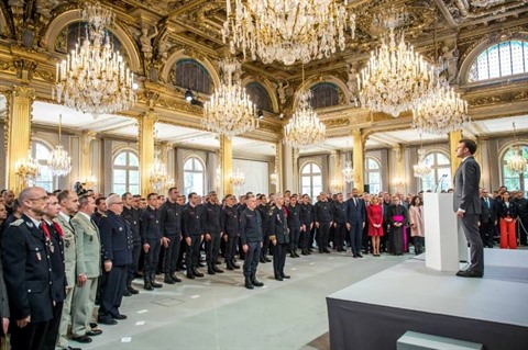 "Merci à vous qui avez pris tous les risques (...) Le pays et le monde tout entier nous ont regardés et vous avez été exemplaires", a déclaré le chef de l'État devant 250 pompiers de Paris, ainsi que des pompiers franciliens, des policiers, des membres de la Croix-Rouge et de la Protection civile, réunis à la mi-journée dans la salle des fêtes de l'Élysée.