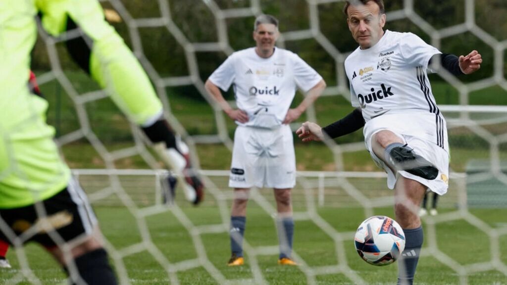 | Emmanuel Macron lors d'un match de football à Plaisir, dans les Yvelines, au profit de l'opération Pièces jaunes, marque un penalty, le 24 avril 2024. |