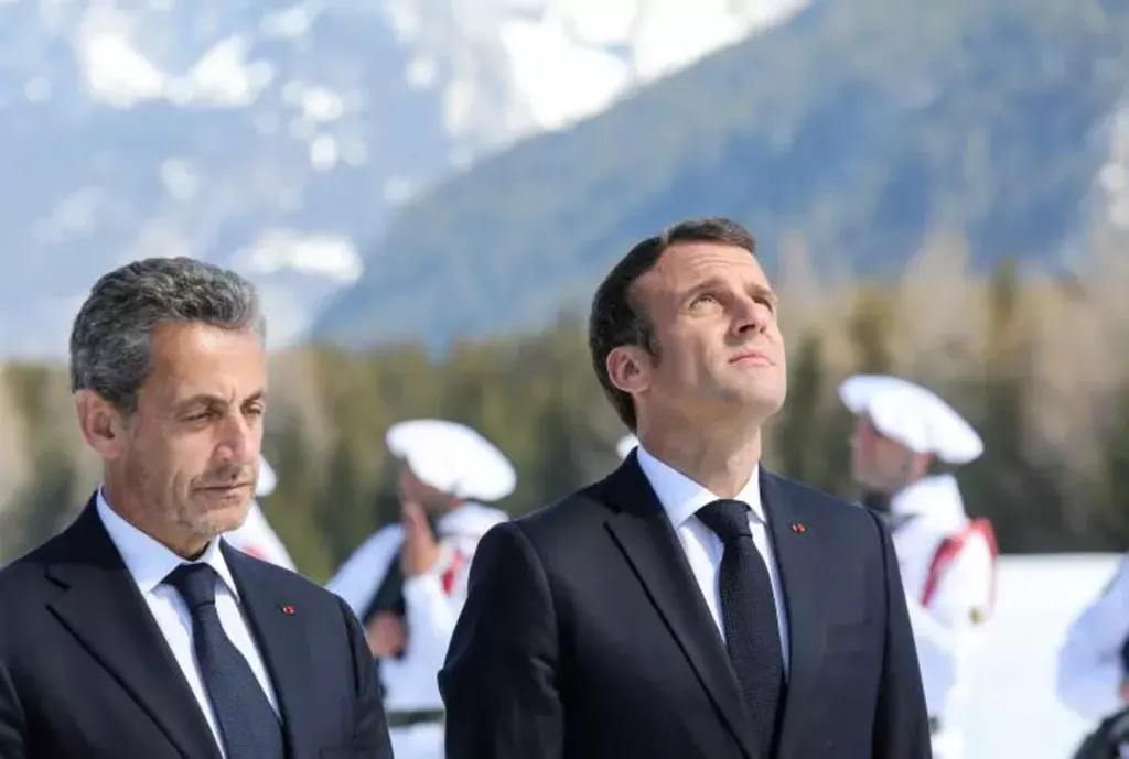 | Le président français Emmanuel Macron (droite) et son prédécesseur Nicolas Sarkozy près de Thorens-Glières le 31 mars 2019 dans les Alpes françaises. |