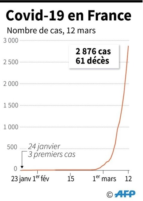 Selon le dernier bilan officiel, 61 personnes sont décédées et 2.876 ont été contaminées - soit près de 600 de plus en 24 heures - dont 129 cas graves placés en réanimation. Par précaution, le gouvernement a demandé la "déprogrammation immédiate des interventions chirurgicales non urgentes" afin de libérer des lits en réanimation, en salles de réveil et du personnel qualifié - conformément au stade 2 du "plan blanc" des hôpitaux : "tous les moyens nécessaires" à la santé seront employés "quoi qu’il en coûte", a insisté le Président, vantant au passage les vertus de l’État-providence.