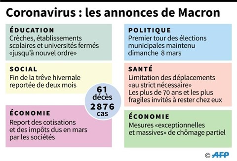 Dans ce contexte, il a fait appel à "la responsabilité" de chacun en demandant de limiter "au strict nécessaire" les déplacements, et aux personnes agées de plus de 70 ans et aux plus fragiles de rester chez eux. Il a maintenu les élections municipales dont le premier tour est prévu dimanche avec des aménagements pour éviter une longue attente aux personnes âgées, les plus vulnérables au virus.