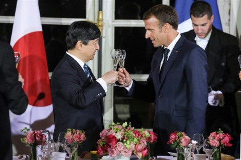 | Emmanuel Macron trinque avec le prince héritier du Japon, Naruhito, le 12 septembre à Versailles. |