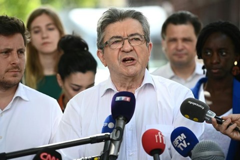 | Jean-Luc Mélenchon, leader de LFI et de la gauche unie Nupes, lors d'une conférence de presse avant le deuxième tour des législatives, le 17 juin à Paris. |