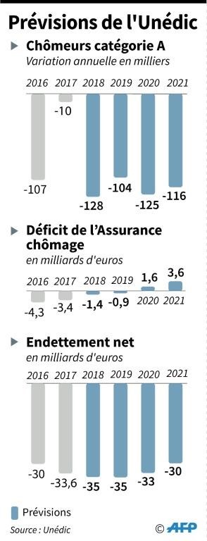 | Prévisions de l'Unédic : chômeurs indemnisés, déficit et endettement de l'Unédic. |