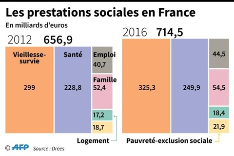 | Montant des prestations sociales par type de prestation, en 2012 et 2016 en France |