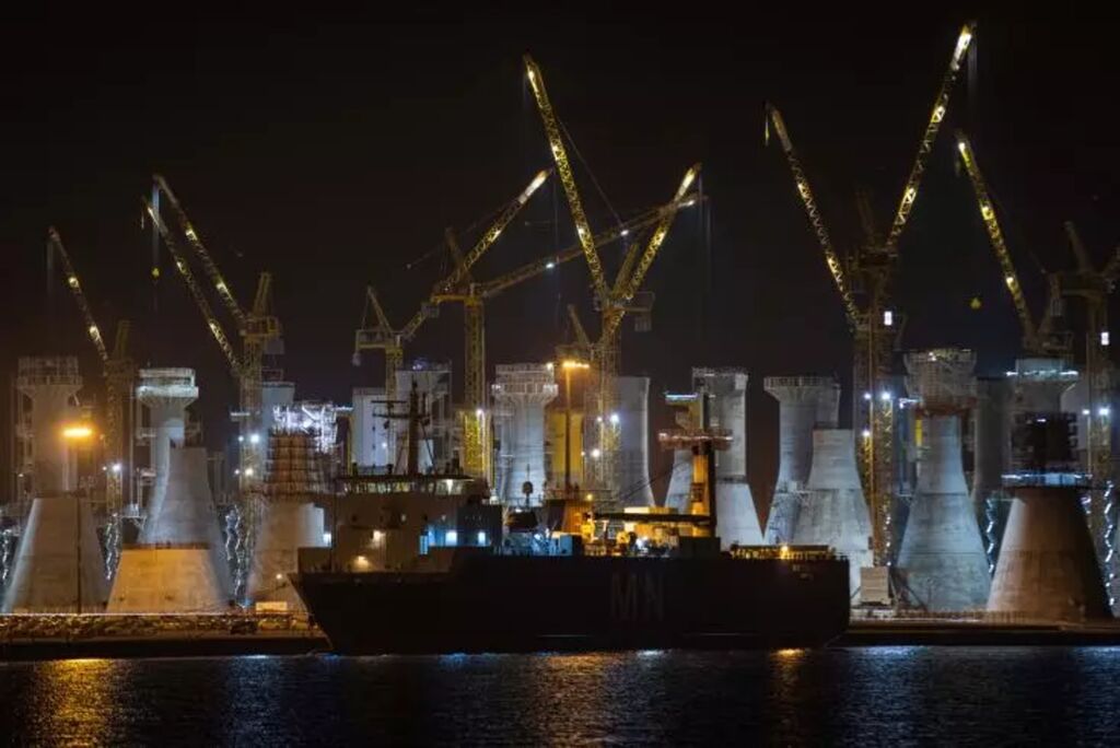 | Les fondations pour le futur parc d'éoliennes de Fécamp lors de leur construction à Le Havre. |