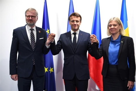 | Le président français Emmnuel Macron (centre), le Premier ministre tchèque Petr Fiala (gauche) et la Première ministre suédoise Magadalena Andersson, lors d'une cérémonie pour la transmission de la présidence du Conseil de l'Union européenne à la République tchèque, le 30 juin à Madrid. |