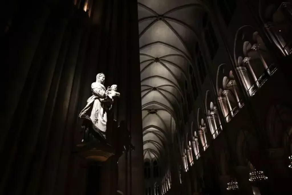| La statue de la Vierge des étudiants de la cathédrale Notre-Dame de Paris avec son nouvel éclairage, à Paris, le 26 février. |